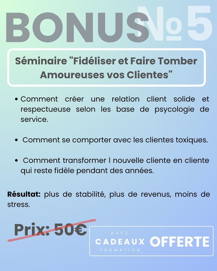 ✔ Apprendre comment gérer chaque cliente pour qu’elle tombe amoureuse de votre travail et devienne fidèle.